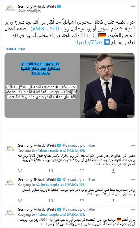 أكد المركز الألماني للإعلام، التابع لوزارة الخارجية الألمانية عبر تويتر، أن وزير الدولة الألماني لشؤون أوروبا ميشائيل روت حذر تركيا من انتهاك التزاماتها بموجب الاتفاقية الأوروبية لحقوق الإنسان لدوافع سياسية، بسبب عدم الإفراج عن رجل الأعمال التركي عثمان كافالا، المحبوس احتياطيًا في السجون التركية منذ ألف يوم.