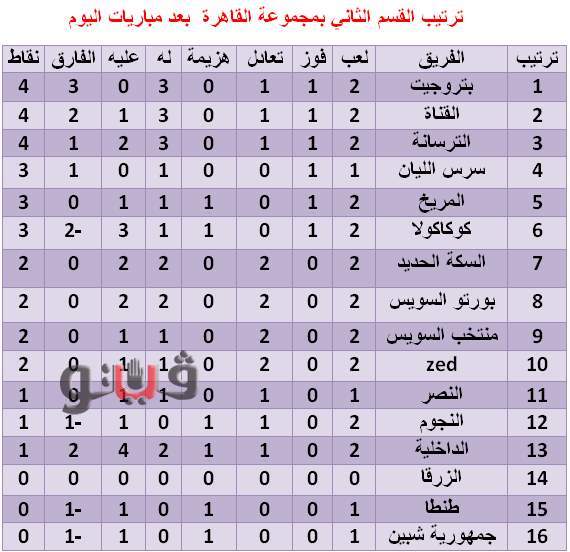 جدول ترتيب مجموعة القاهرة بالقسم الثاني بعد مباريات اليوم