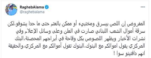وكتب راغب علامة تغريدة على تويتر: "المفروض إن اللص بيسرق ومختبئ أو ممكن بالعتم حتى ما حدا يشوفو، لكن سرقة أموال الشعب اللبناني صارت في العلن وعلى وسائل الإعلام وفي نشرات الأخبار يظهر اللصوص بكل وقاحة في أبراجهم المحصنة، البنك المركزي يقول أموالكم مع البنوك، البنوك تقول أموالكم مع المركزي، والحقيقة أنهم دافنينو سوا!"