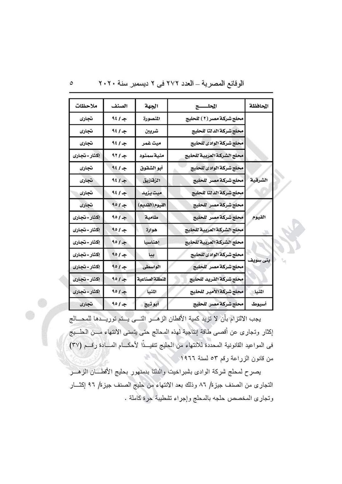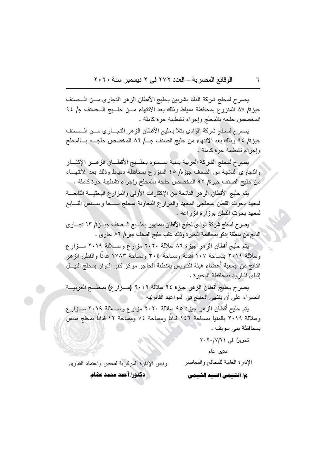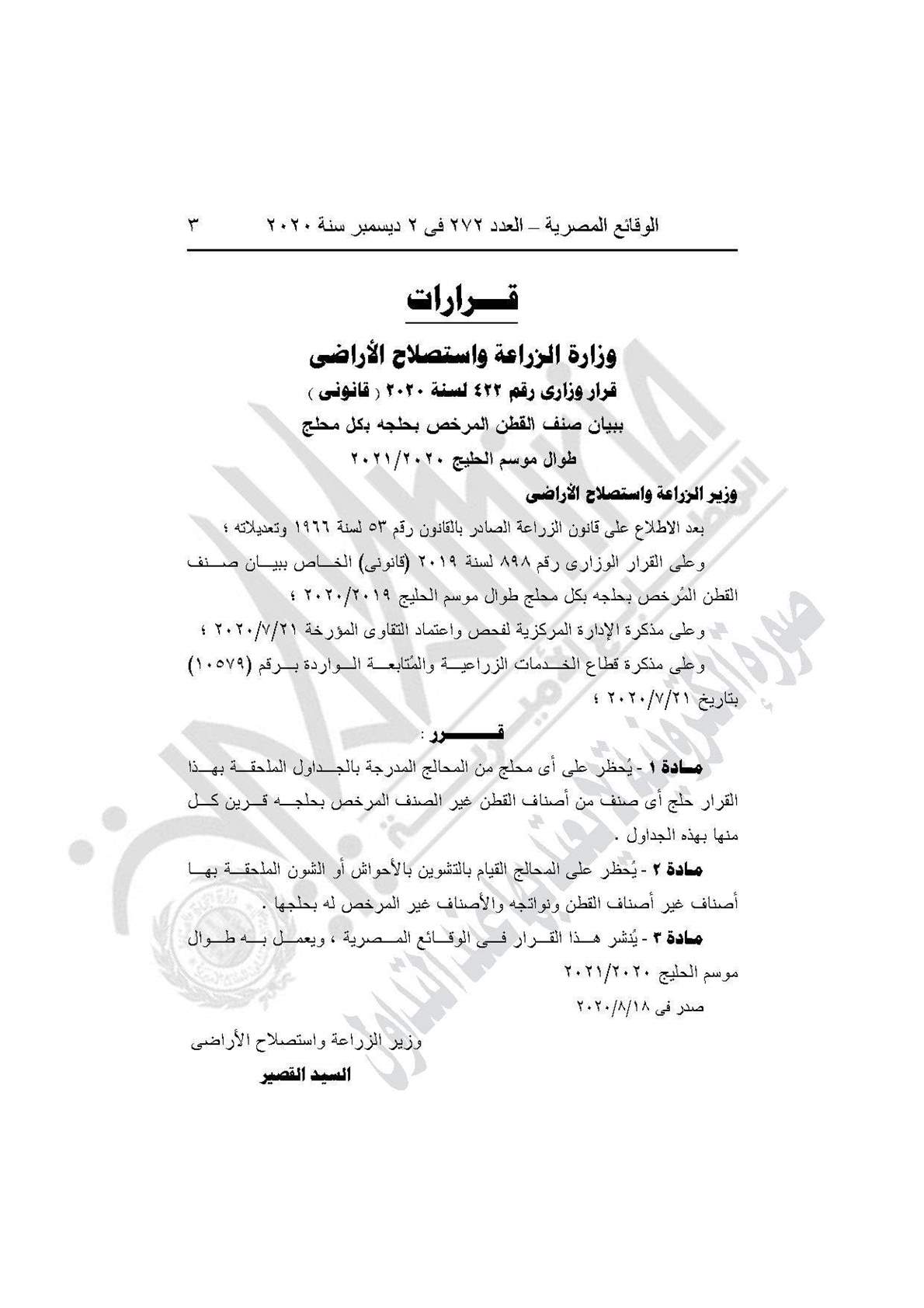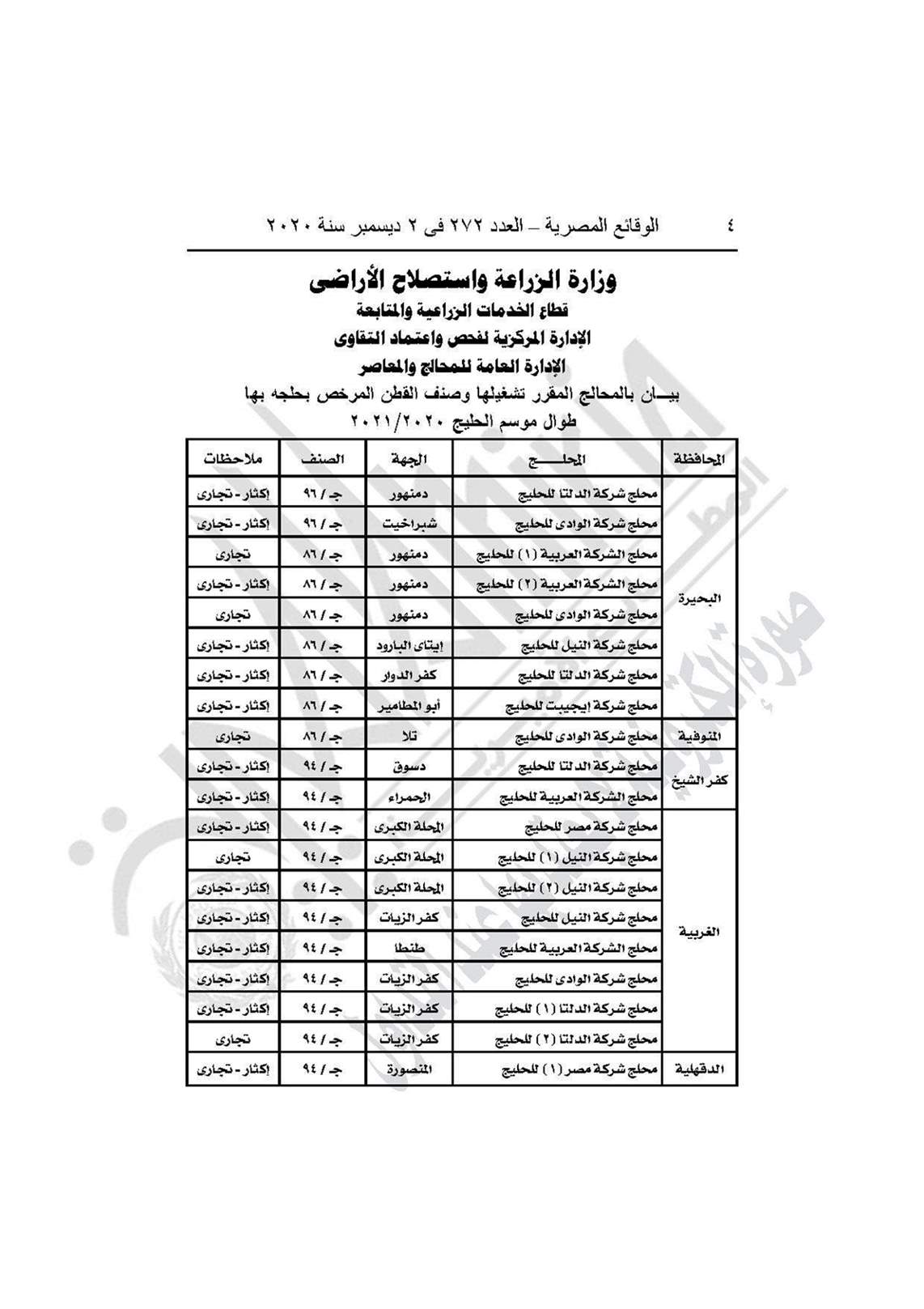 نشرت جريدة الوقائع المصرية في عددها رقم 272، الصادر في 2 ديسمبر 2020، قرار وزارة الزراعة واستصلاح الأراضي رقم 422 لسنة 2020 (قانوني)، بشأن بيان صنف القطن المرخص بحلجه بكل محلج طوال موسم الحليج 2020/2021.