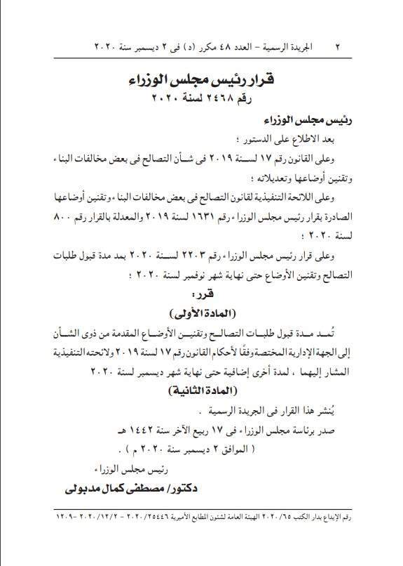 وافق مجلس الوزراء، فى اجتماعه اليوم، برئاسة الدكتور مصطفى مدبولى، رئيس مجلس الوزراء، على مد فترة التقدم للتصالح فى مخالفات البناء، حتى نهاية العام.