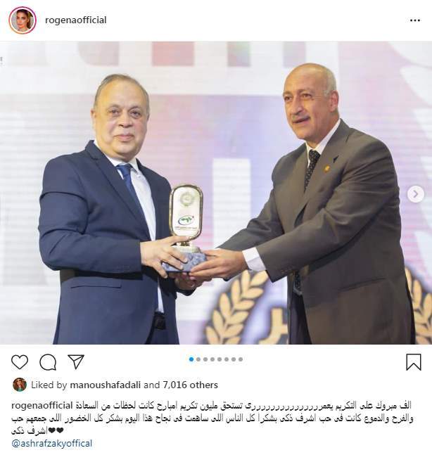 وكتبت روجينا تغريدة على "تويتر": "ألف مبروك على التكريم ياعمرررررررررررررررى.. تستحق مليون تكريم.. إمبارح كانت لحظات من السعادة والفرح.. والدموع كانت فى حب أشرف زكي.. بشكر كل الناس اللى ساهمت فى نجاح هذا اليوم.. بشكر كل الحضور اللى جمعهم حب أشرف زكى".