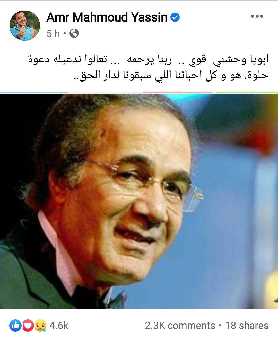ونشر عمرو محمود ياسين صورة لوالده معلقا عليها: "أبويا وحشني قوي .. ربنا يرحمه ... تعالوا ندعيله دعوة حلوة. هو و كل أحبائنا اللي سبقونا لدار الحق".