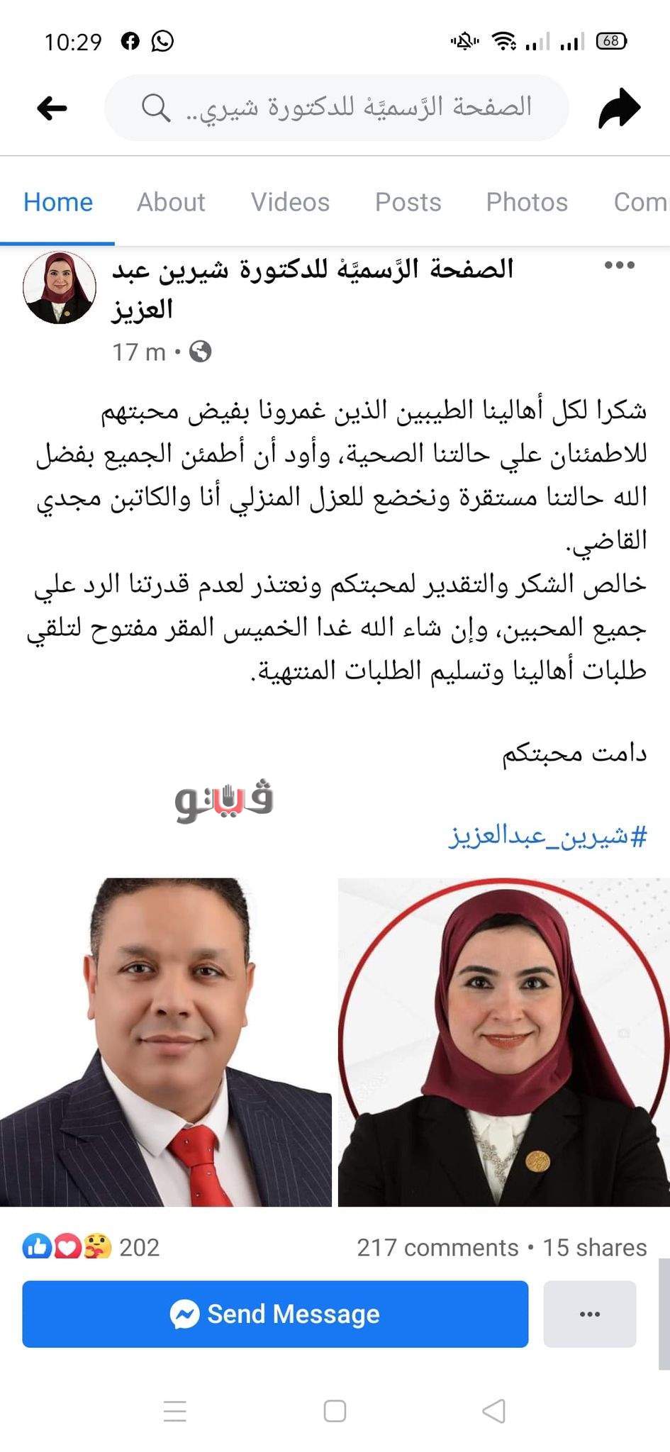 أعلنت الدكتورة شيرين عبدالعزيز، عضو مجلس النواب عن القائمة الوطنية، بمحافظة المنوفية إصابتها بفيروس كورونا المستجد "كوفيد19"، فضلاً عن إصابة زوجها القبطان مجدي القاضي بالفيروس أيضًا.