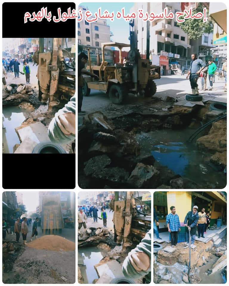 وشملت إصلاح ماسورة مياه بشارع مسجد التوحيد من المجزر الآلي وشفط تراكمات المياه وإصلاح ماسورة مياه بشارع زغلول بالهرم.