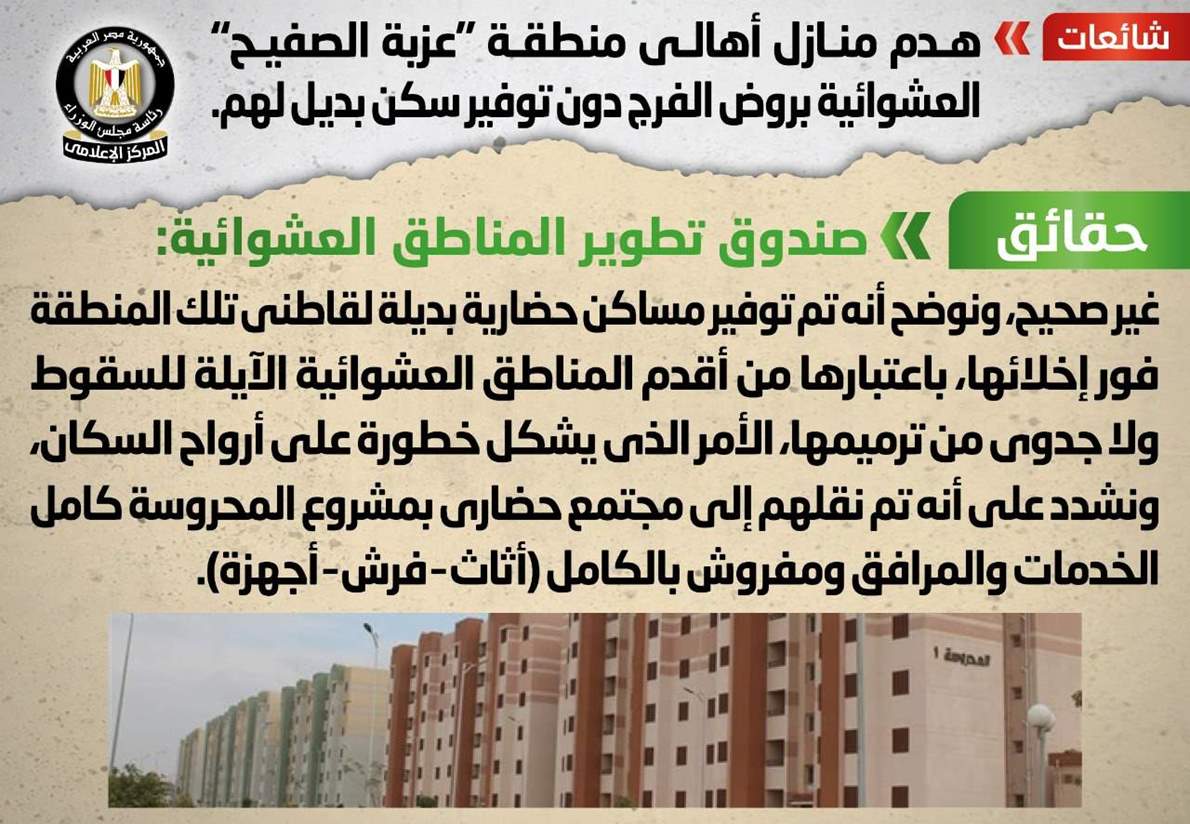 وقام المركز الإعلامي لمجلس الوزراء بالتواصل مع صندوق تطوير المناطق العشوائية، والذي نفى تلك الأنباء.