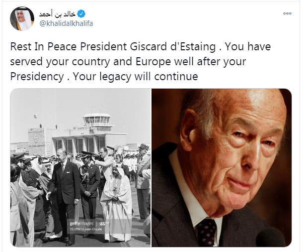 وكتب خالد بن أحمد تغريدة على تويتر: "أرقد في سلام الرئيس جيسكار ديستان. فقد خدمت وطنك وأوروبا بشكل جيد بعد رئاستك. وميراثك سيستمر".