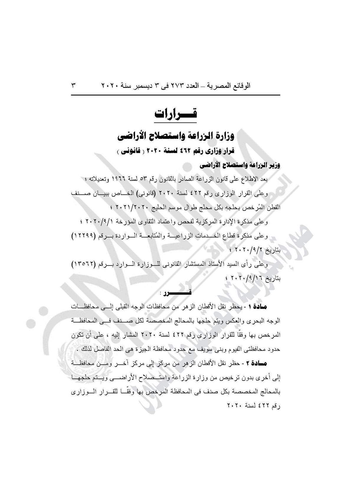القرار رقم 462 لسنة 2020 (قانوني)، بشأن حظر نقل الأقطان الزهر من محافظات الوجه القبلى إلى محافظات الوجه البحرى والعكس ويتم حلجها بالمحالج المخصصة لكل صنف فى المحافظة المرخص بها وفقًا للقرار الوزارى رقم 422 لسنة 2020 المشار إليه ، على أن تكون حدود محافظتى الفيوم وبنى سويف مع حدود محافظة الجيزة هى الحد الفاصل لذلك .