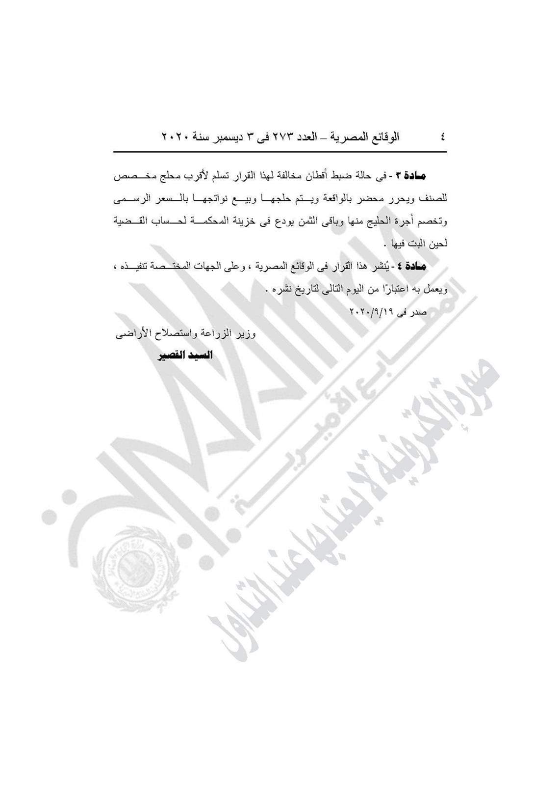 نشرت جريدة الوقائع المصرية في عددها 273، الصادر في 3 ديسمبر 2020، قرارا وزرة الزراعة واستصلاح الأراضي بشأن حظر نقل الأقطان الزهر من محافظات الوجه القبلى إلى محافظات الوجه البحرى والعكس، ومنح الحماية لبعص الأصناف النباتية.