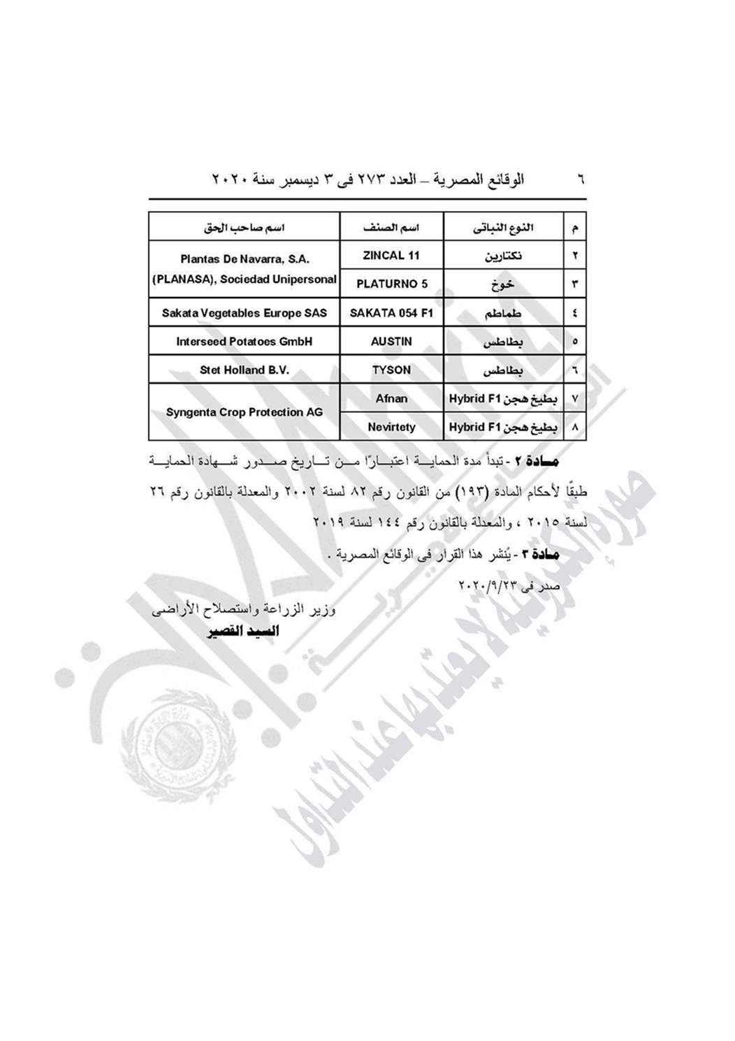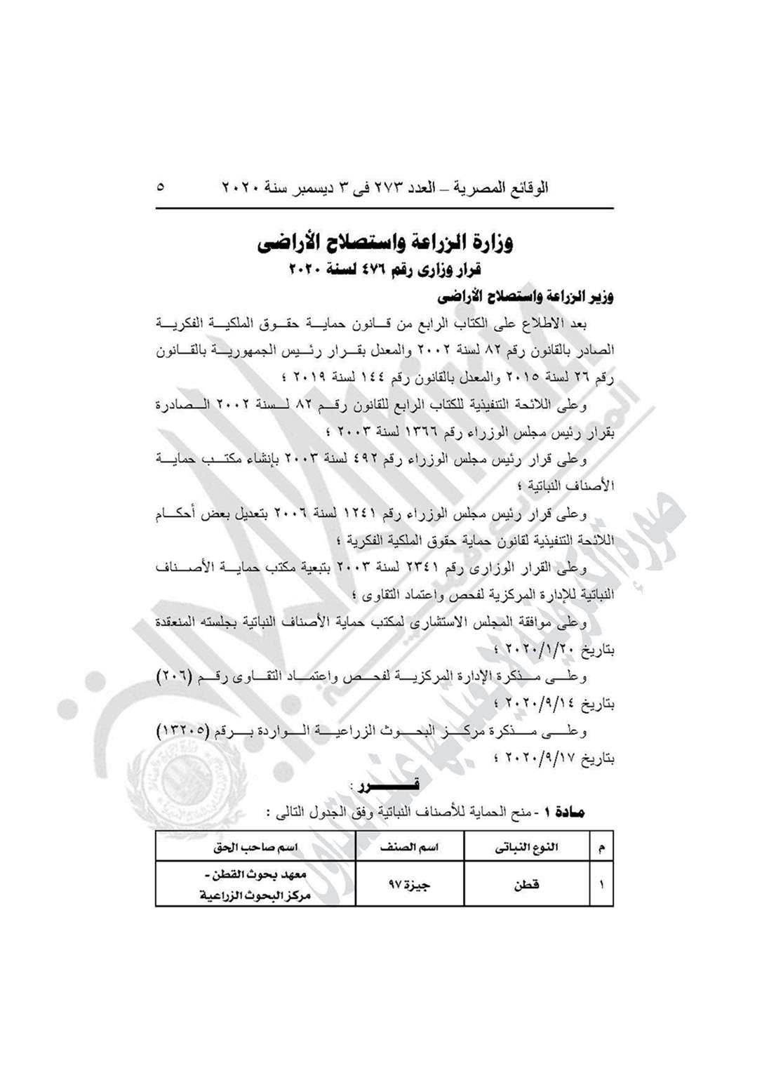 والقرار رقم 476 لسنة 2020، بشأن منح الحماية لبعض الأصناف النباتية وفق الجدول.