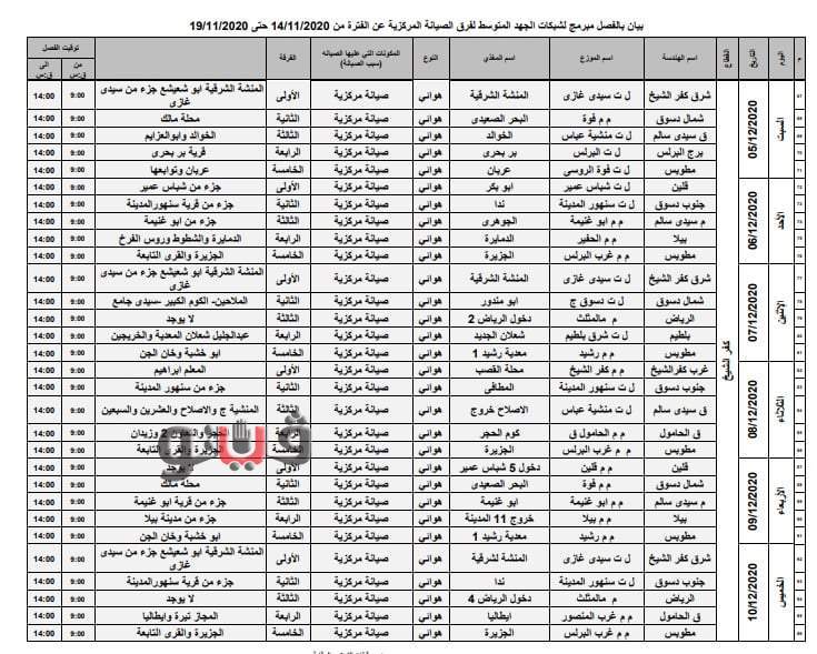 أعلنت شركة شمال الدلتا لتوزيع الكهرباء المناطق التى سيتم قطع الكهرباء عنها بمحافظة كفر الشيخ بدءا من السبت المقبل وحتى الخميس ذلك نظرا لأعمال الصيانة التى تتم بالشبكة الكهربائية.