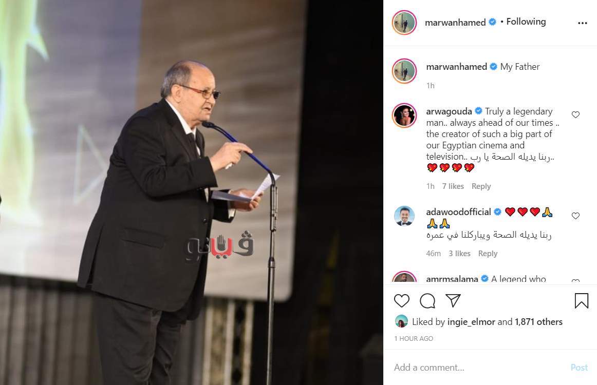 ونشر “مروان” صورة لوالده أثناء تكريمه في حفل افتتاح مهرجان القاهرة، عبر حسابه الشخصي بموقع تبادل الصور والفيديوهات القصيرة “إنستجرام”، وعلق قائلًا: “هذا أبي”.