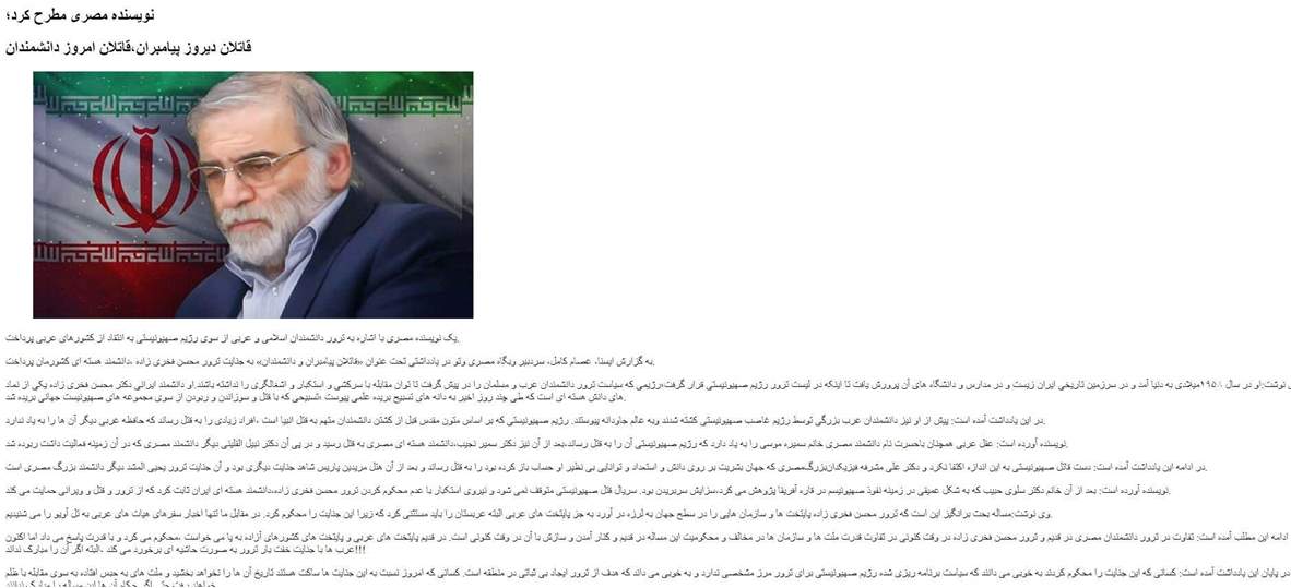 وتحدث رئيس تحرير فيتو في مقال قتلة الأنبياء والعلماء عن العالم الإيرانى الدكتور محسن فخري زاده أحد أيقونات العلم النووي، والذي انضم منذ أيام قليلة إلي حبات المسبحة العلمية التي انفرط عقدها بالقتل والحرق والخطف من قبل عصابات الصهيونية العالمية.