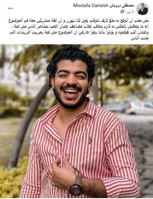 وقال "درويش": "مش معنى أنه ده طلع لايف دلوقتي يقول كنا بنهزر وإن أهله مشتركين معاه في الموضوع أنه مايتعاقبش بالعكس ده لازم يتعاقب عقاب مضاعف عشان اللعب بمشاعر الناس مش لعبة".