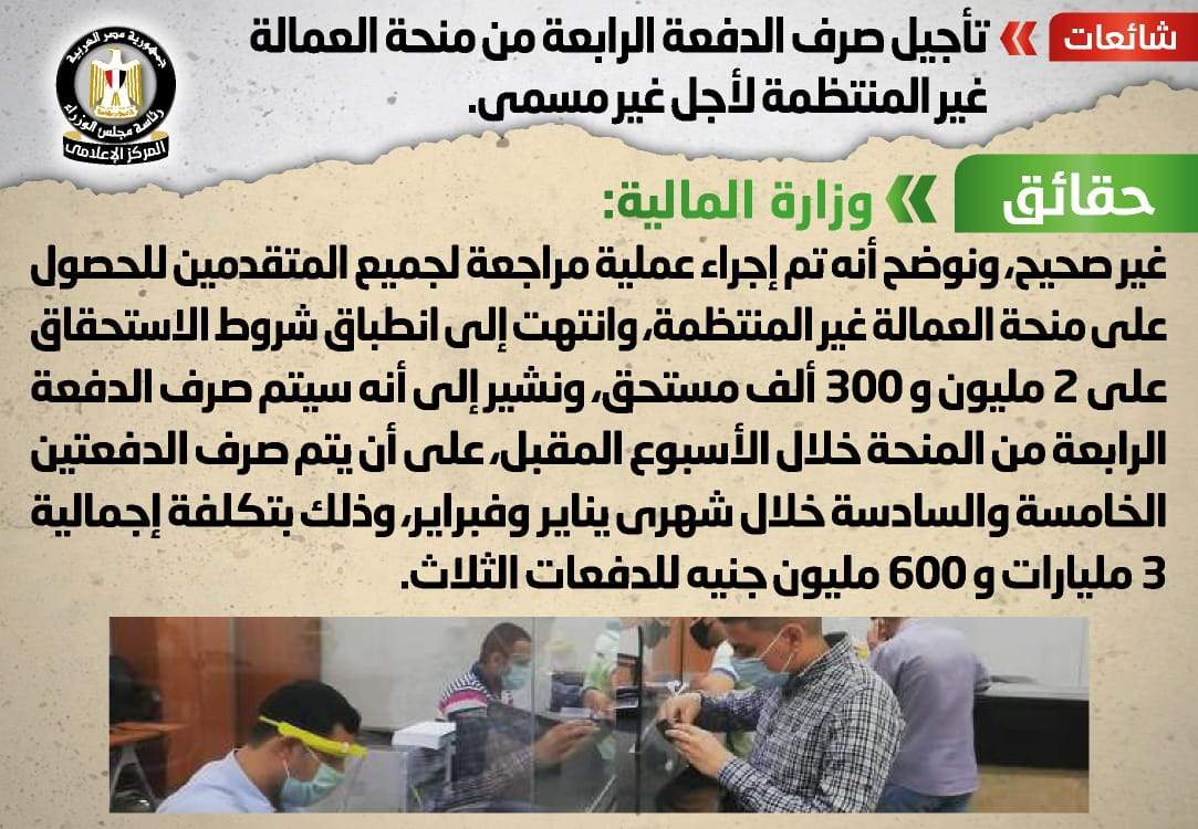 وقام المركز الإعلامي لمجلس الوزراء بالتواصل مع وزارة المالية، والتي نفت تلك الأنباء، مُؤكدةً أنه لا صحة لتأجيل صرف الدفعة الرابعة من منحة العمالة غير المنتظمة لأجل غير مسمى، مُوضحةً أنه تم إجراء عملية مراجعة لجميع المتقدمين للحصول على منحة العمالة غير المنتظمة، وانتهت إلى انطباق شروط الاستحقاق على2 مليون و300 ألف مستحق.