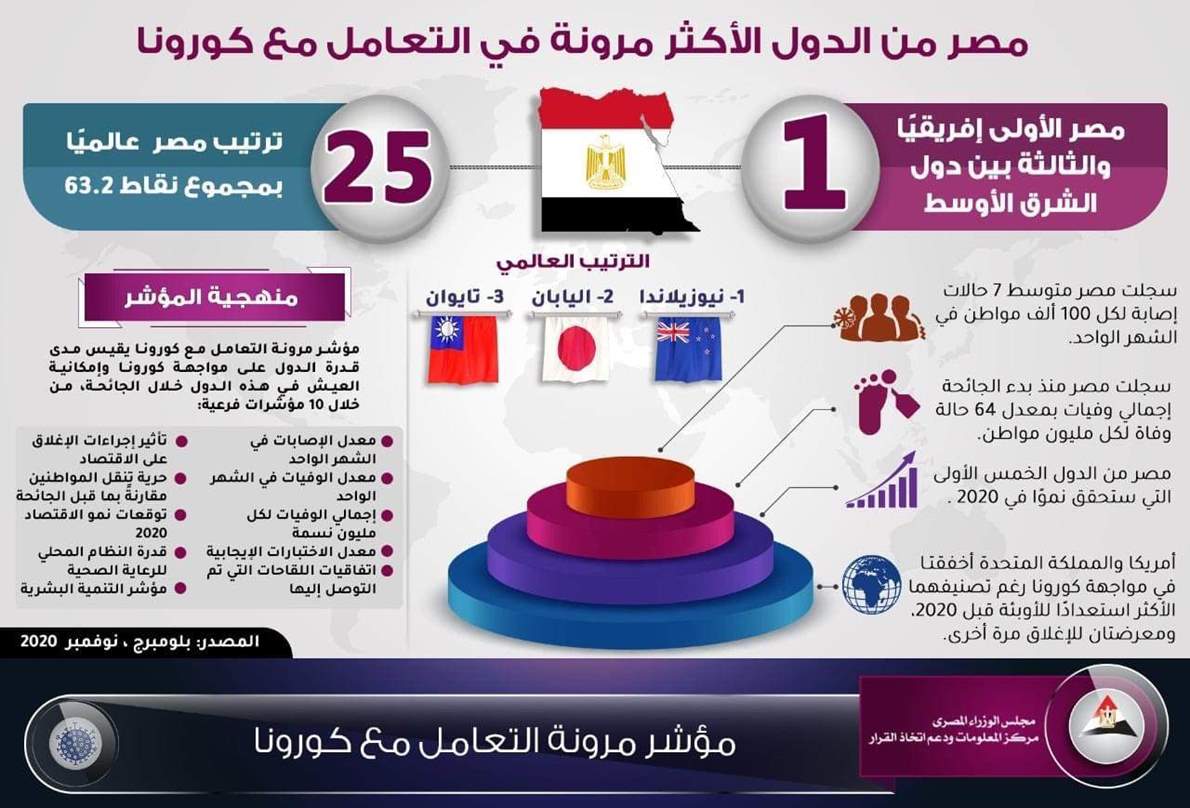 استعرض مركز المعلومات ودعم اتخاذ القرار بمجلس الوزراء في إنفوجراف " نشر على الصفحة الرسمية للمركز على موقع التواصل الاجتماعي فيسبوك مؤشر مرونة التعامل مع كورونا" ، حيث جاءت مصر في المركز الأول إفريقيًا بينما احتلت المركز الثالث على مستوى الشرق الأوسط أما على الصعيد العالمي فقد جاءت مصر في المركز الـ 25 بمجموع نقاط 63,2.