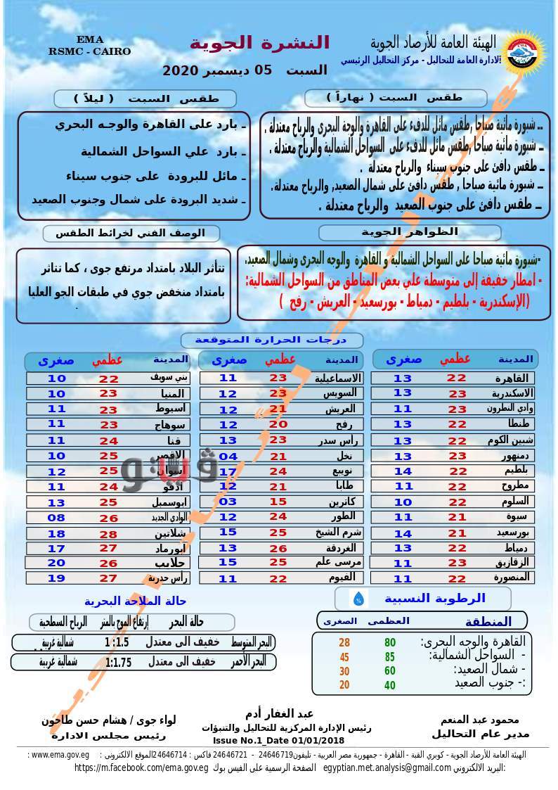 أعلنت هيئة الأرصاد الجوية، حالة الطقس السبت، حيث يسود طقس مائل للدفء نهارا على أغلب البلاد وعلى السواحل الغربية مائل للبرودة ليلا، وشديد البرودة على سيناء وجنوب الصعيد