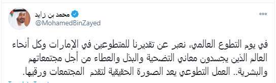وكتب الشيخ محمد بن زايد تغريدة على تويتر "في يوم التطوع العالمي، نعبر عن تقديرنا للمتطوعین في الإمارات وكل أنحاء العالم الذين يجسدون معاني التضحية والبذل والعطاء من أجل مجتمعاتيم والبشرية.. العمل التطوعي يعد الصورة الحقيقية لتقدم المجتمعات ورقيها"