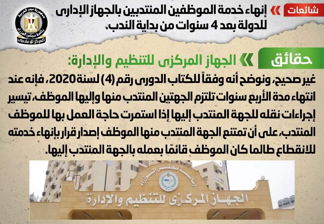 وقام المركز الإعلامي لمجلس الوزراء بالتواصل مع الجهاز المركزي للتنظيم والإدارة، والذي نفى تلك الأنباء، مُؤكداً أنه لا صحة لإنهاء خدمة الموظفين المنتدبين بالجهاز الإداري للدولة بعد 4 سنوات من بداية الندب.