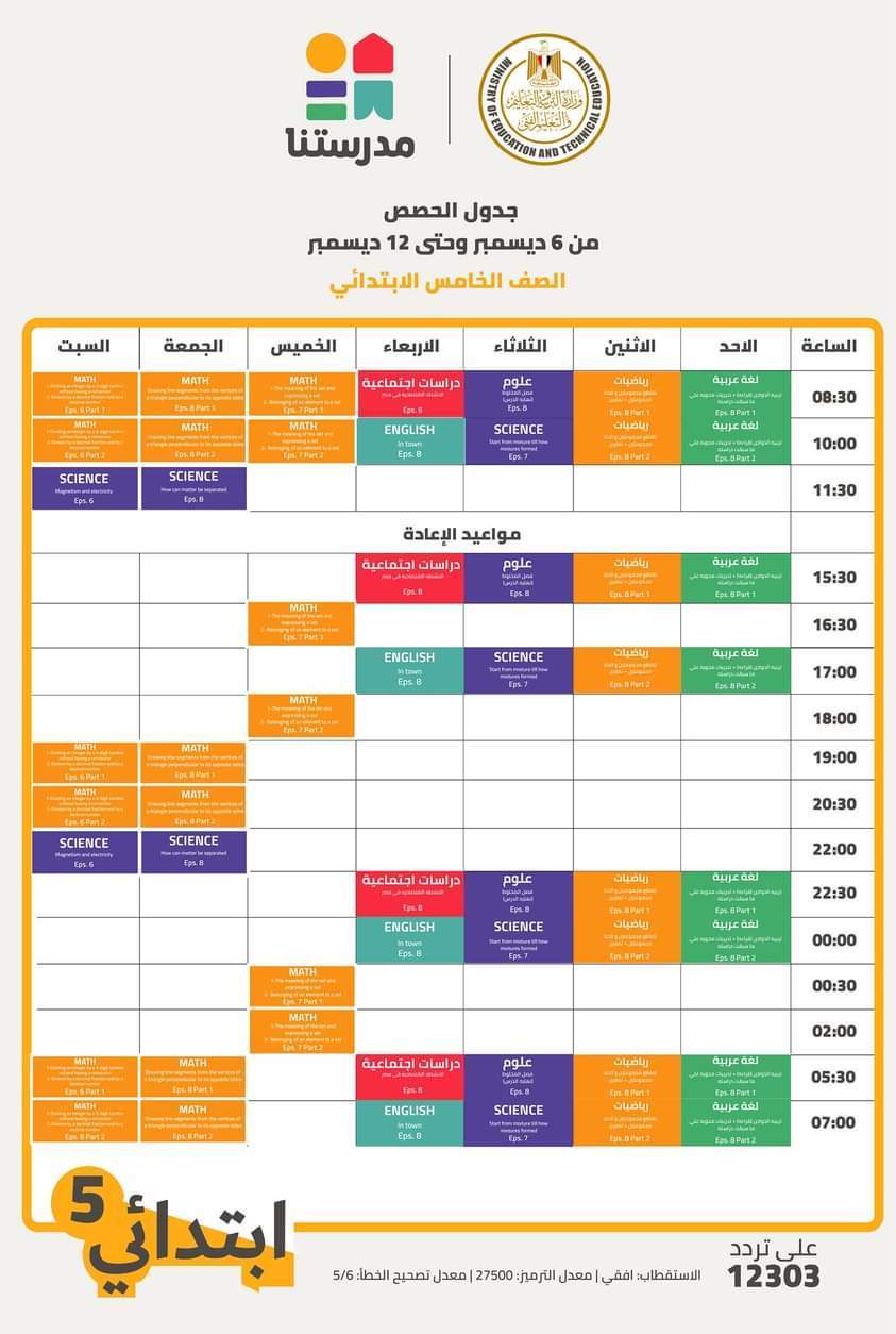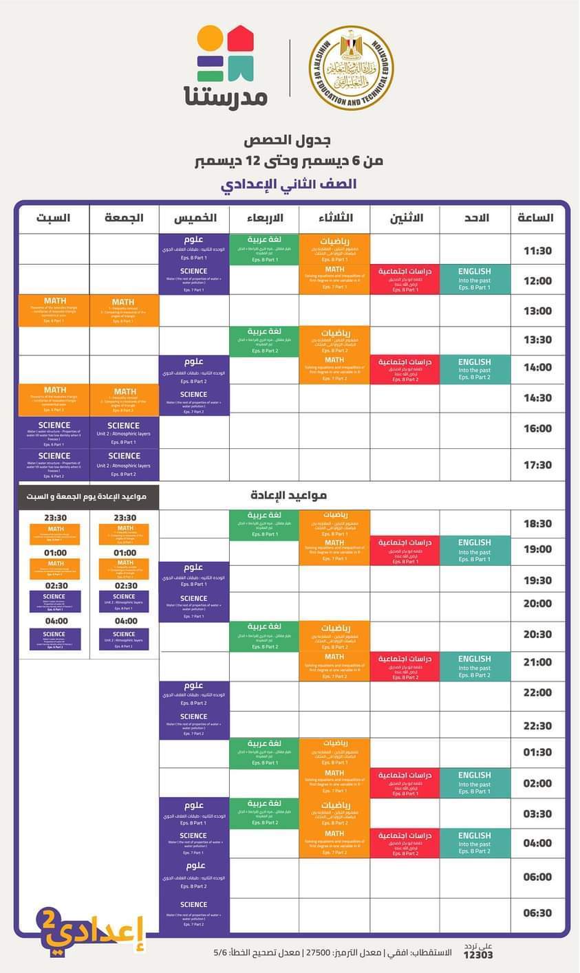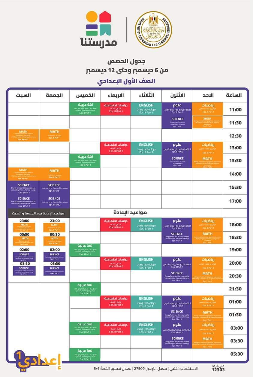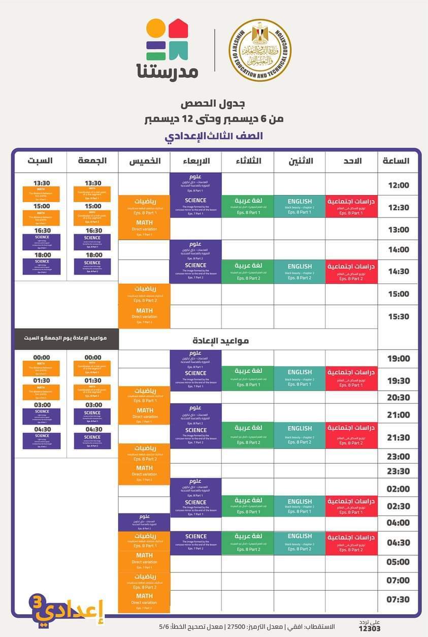 وأوضحت وزارة التربية والتعليم والتعليم الفنى ان جدول الحصص يشمل الطلاب من الصف الرابع الابتدائي حتى الثالث الإعدادي على القناة التعليمية "مدرستنا”، في الفترة من يوم الأحد ٦ ديسمبر حتى السبت ١٢ ديسمبر ٢٠٢٠.