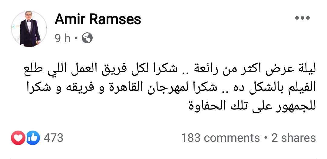 وكتب أمير رمسيس : "ليلة عرض اكثر من رائعة .. شكرا لكل فريق العمل اللي طلع الفيلم بالشكل ده .. شكرا لمهرجان القاهرة و فريقه و شكرا للجمهور على تلك الحفاوة".