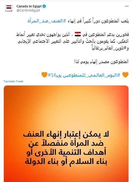 وكتبت سفارة كندا في القاهرة تغريدة على تويتر قالت فيها : "يلعب المتطوعون دوراً كبيراً في إنهاء #العنف_ضد_المرأة.. فخورين بدعم المتطوعين في مصر، الذين يواجهون تحدي تغيير أنماط التفكير، كما يقومون بالحثّ والتأثيير على التغيير الاجتماعي الإيجابي و#تلوين_العالم_برتقالياً المتطوعون مصدر إلهام يومي لنا! #اليوم_العالمي_للمتطوعين #16يوم"
