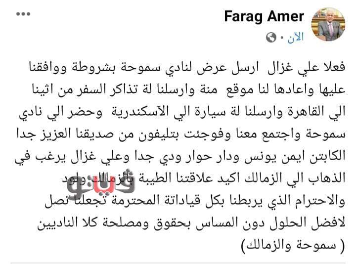وقال فرج عامر عبر حسابه: " فعلا علي غزال أرسل عرض لنادي سموحة بشروطة ووافقنا عليها واعادها لنا موقع منة وارسلنا لة تذاكر السفر من اثينا الي القاهرة وارسلنا لة سيارة الي الإسكندرية وحضر الي نادي سموحة واجتمع معنا وفوجئت بتليفون من صديقنا العزيز الكابتن ايمن يونس ودار حوار ودي جدا وأن علي غزال يرغب في الذهاب الي الزمالك.. اكيد علاقتنا الطيبة بالزمالك والود والاحترام الذي يربطنا بكل قياداتة المحترمة تجعلنا نصل لافضل الحلول دون المساس بحقوق ومصلحة كلا الناديين ( سموحة والزمالك)".