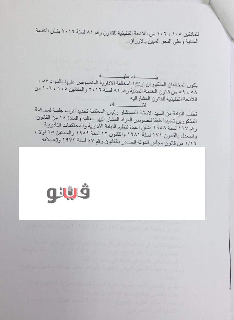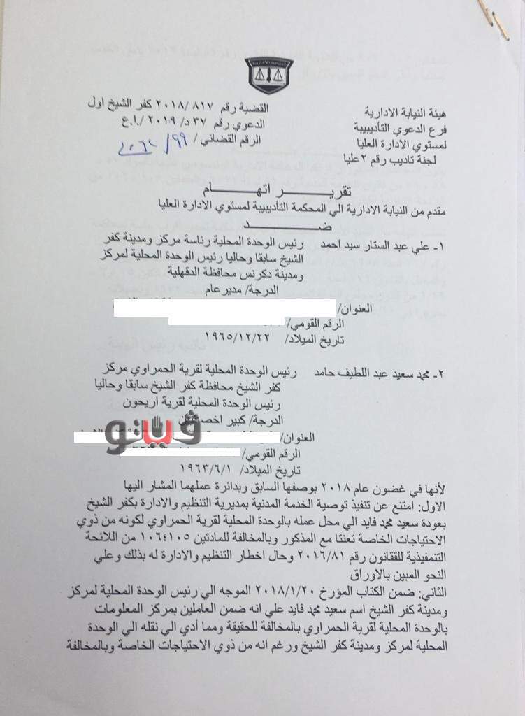 وأضافت أن محمد سعيد عبد اللطيف، رئيس الوحدة المحلية لقرية الحمراوي التابعة لمركز كفر الشيخ سابقًا وحاليًا رئيس الوحدة المحلية لقرية أريحون قام بتضمين الخطاب المؤرخ 20 يناير 2018 الموجه الى رئيس الوحدة المحلية لمركز ومدينة كفر الشيخ إسم سعيد محمد فايد على أنه ضمن العاملين بمركز المعلومات بالوحدة المحلية لقرية الحمراوي بالمخالفة للحقيقة مما أدى الى نقله إلى الوحدة المحلية لمركز ومدينة كفر الشيخ رغم كونه من ذوي الإحتياجات الخاصة، وبالمخالفة للمادتين 105 و 106 من اللائحة التنفيذية للقانون رقم 81 لسنة 2016 بشأن الخدمة المدنية.