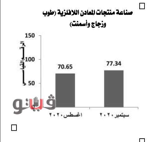 بلغ الرقـم القيـاسـي لصناعة منتجات المعادن اللافلزية (طوب وزجاج وأسمنت) 77.34 خلال شهر سبتمبر 2020 مقارنة بشهر أغسطس 2020 حيث بلغ 70.65 بارتفاع قدره 9.5٪ وذلك طبقا البيـانات الأولية للرقـم القياسي لإنتاج الصناعات التحويلية والاستخراجية عن شهـر سبتمبر 2020،الصادرة عن الجهاز المركـزي للتعبئة العامـة والإحصاء.