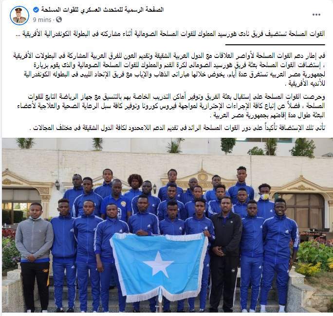 أكد المتحدث العسكري للقوات المسلحة العميد تامر الرفاعي، عبر صفحته الرسمية على فيس بوك، أن القوات المسلحة استضافت فريق نادى هورسيد المملوك للقوات المسلحة الصومالية أثناء مشاركته فى البطولة الكونفدرالية الأفريقية، والذى يقوم بزيارة لجمهورية مصر العربية تستغرق عدة أيام، يخوض خلالها مباراتى الذهاب والإياب مع فريق الاتحاد الليبى فى البطولة الكونفدرالية للأندية الأفريقية.