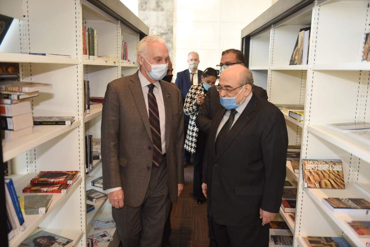 و استمع د. الفقى ورئيس الجامعه الأمريكيه بالقاهره والوفد المرافق له إلى شرح تفصلي من المدير التنفيذي للجهاز الوطنى للإداره والاستثمار حيث رافقهم فى جوله تفقديه داخل مدينة الفنون والثقافه بدأت بزياره مكتبه العاصمه استقبلهم فيها د.زين عبد الهادي مدير المكتبه اطلعهم على أهم ماتحتويه من كتب تاريخيه وتراثيه وثقافيه متنوعه واهم القاعات الموجوده بيها .