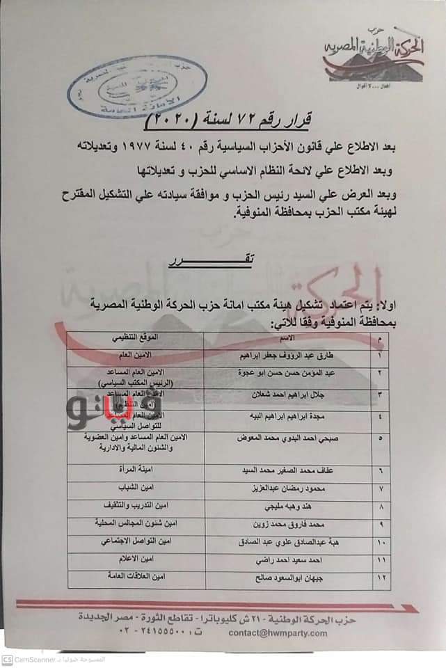 يتم اعتماد تشكيل هيئة مكتب أمانة حزب الحركة الوطنية المصرية بمحافظة المنوفية وفقا للآتي: