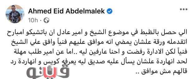 وكتب عبد الملك، عبر حسابه الشخصي على موقع التغريدات القصيرة "تويتر": "اللي حصل بالظبط في موضوع الشيخ وأمير عادل إن باتشيكو امبارح اتقدمله ورقة علشان يمضي إنه موافق عليهم فنياً، وافق على الشيخ فنياً لكن الإدارة رفضت وإحنا عارفين ليه.. أما عن أمير طلب مهلة لحد النهارده علشان يسأل عليه صديق ليه يعرفه كويس والنهارده رد قالهم مش موافق".