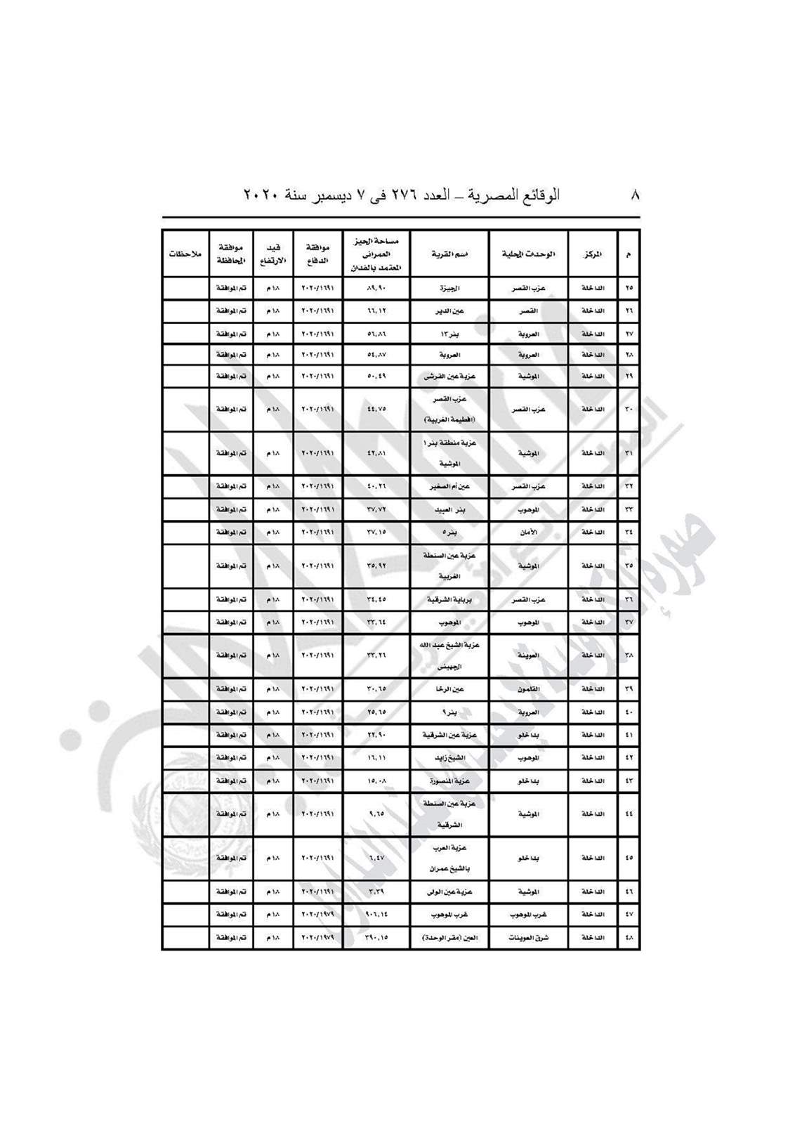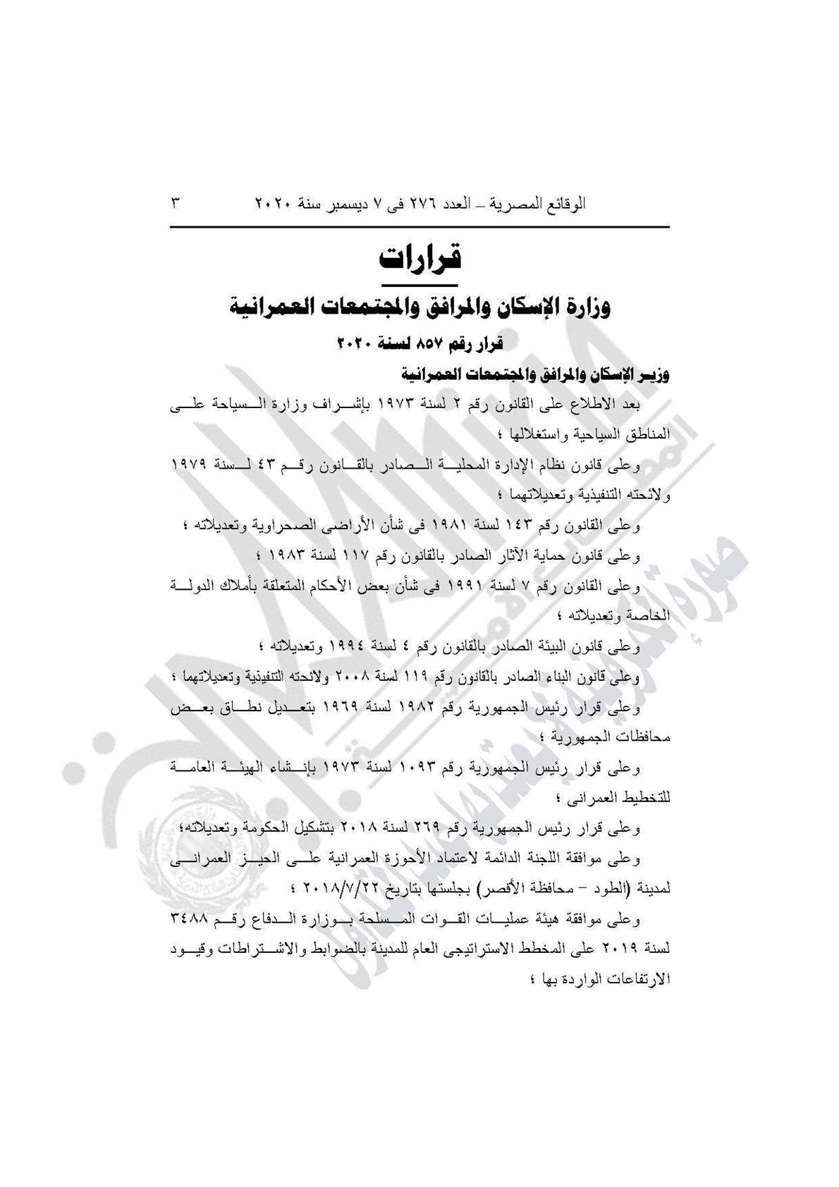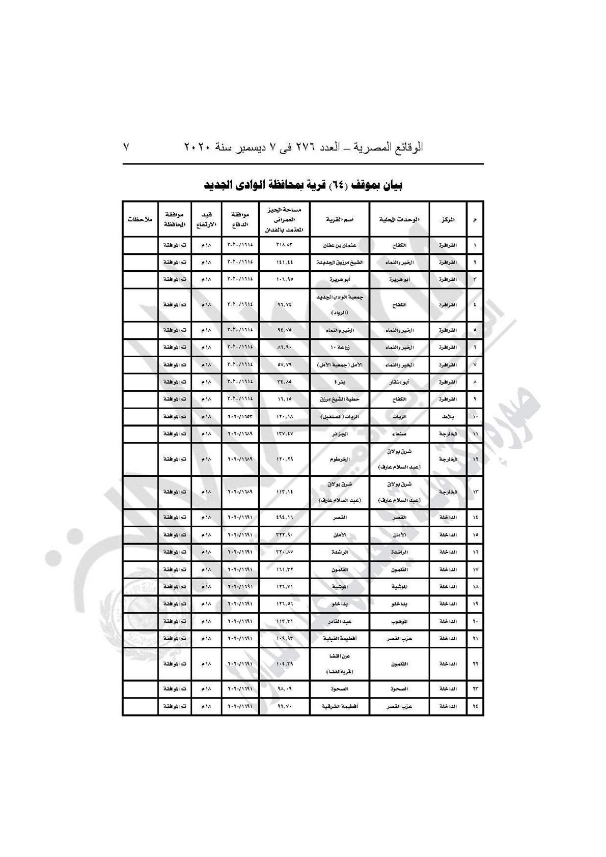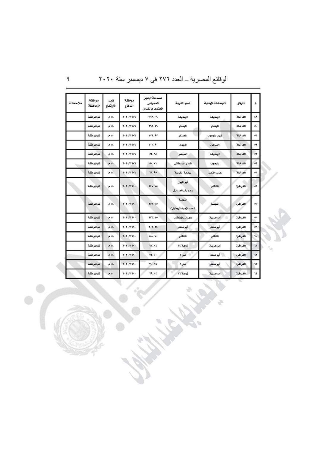 والقرار رقم 892 لسنة 2020، باعتماد المخطط الاستراتيجي العام لـ64 قرية بمركز (الخارجة والداخلة وبلاط والفرافرة) بمحافظة الوادي الجديد، طبقًا للاشتراطات التخطيطية والبنائية مع مراعاة الحد الاقصى للارتفاعات الواردة بموافقة هيئة عمليات القوات المسلحة.