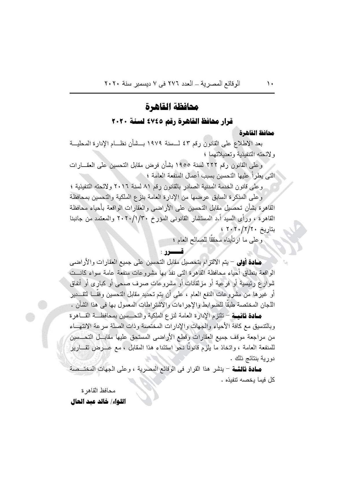 القرار رقم 4745 لسنة 2020، بشأن الالتزام بتحصيل مقابل التحسين على جميع العقارات والأراضي الواقعة بنطاق أحياء محافظة القاهرة، التي نفذ بها مشروعات منفعة عامة سواء كانت شوارع رئيسية أو فرعية أو مزلقانات أو مشروعات صرف صحى أو كباري أو أنفاق أو غيرها من مشروعات النفع العام.