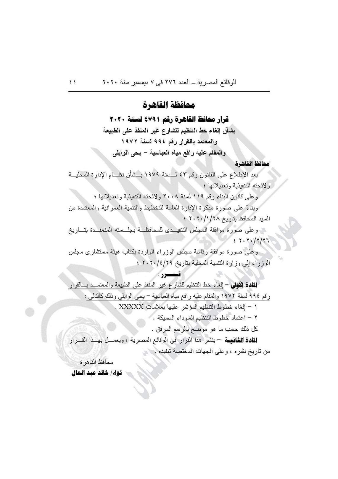 والقرار رقم 4791 لسنة 2020 بشأن إلغاء خط التنظيم للشارع غير المنفذ على الطبيعة والمعتمد بالقرار رقم 994 لسنة 1972 والمقام عليه رافع مياه العباسية بحي الوايلي.