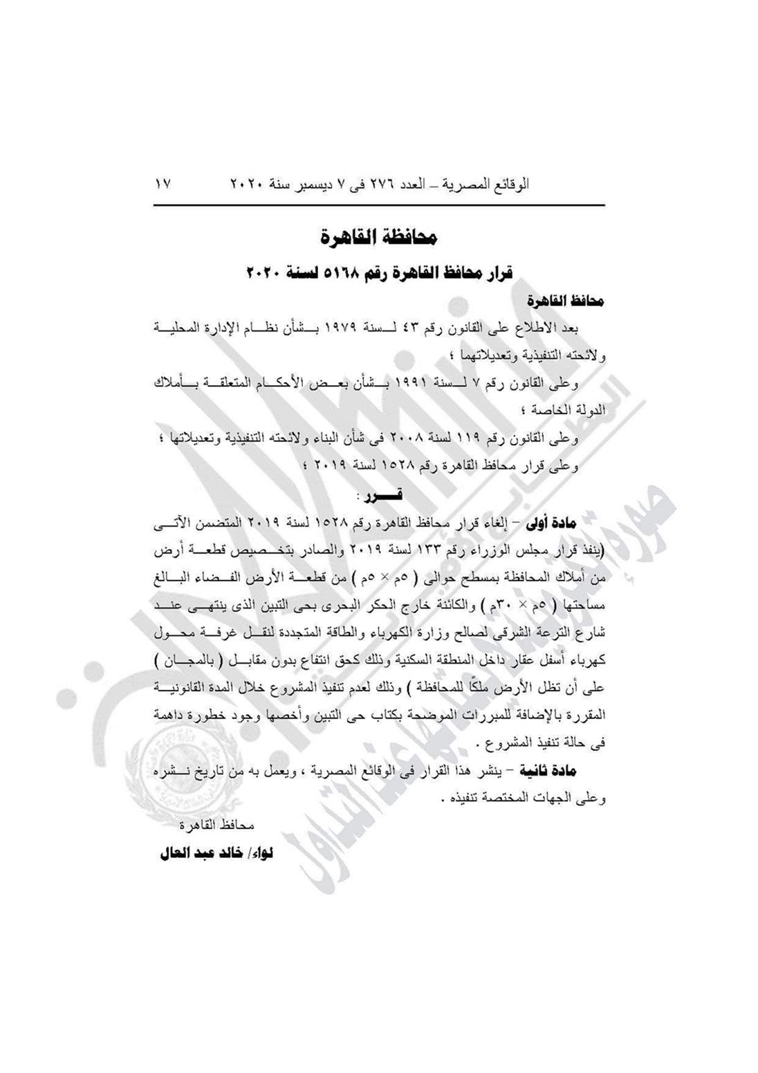 والقرار رقم 5168 لسنة 2020، بشأن إلغاء قرار محافظ القاهرة رقم 1528 لسنة 2019، المتضمن تنفيذ قرار مجلس الوزراء رقم 133 لسنة 2019، والصادر بتخصيص قطعة أرض من أملاك المحافظة خارج الحكر البحري بحي التبين لصالح وزارة الكهرباء والطاقة.