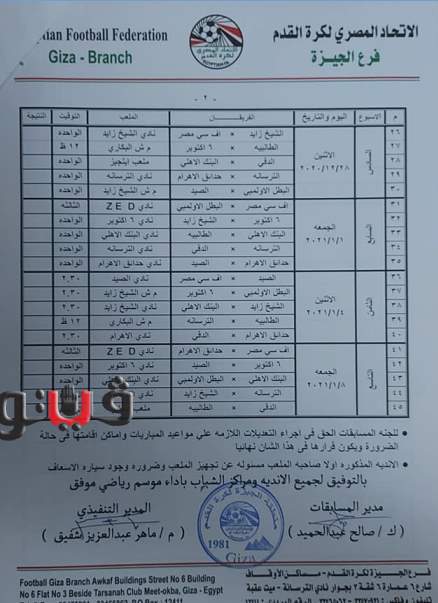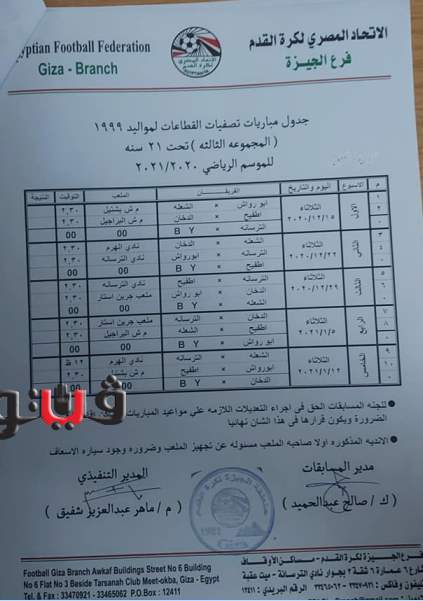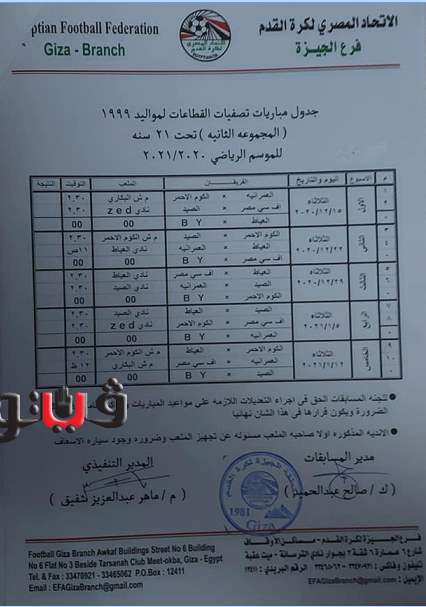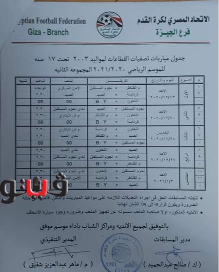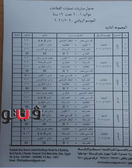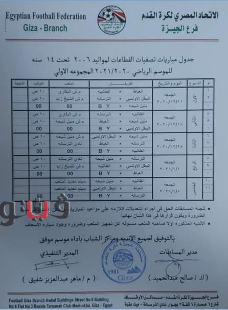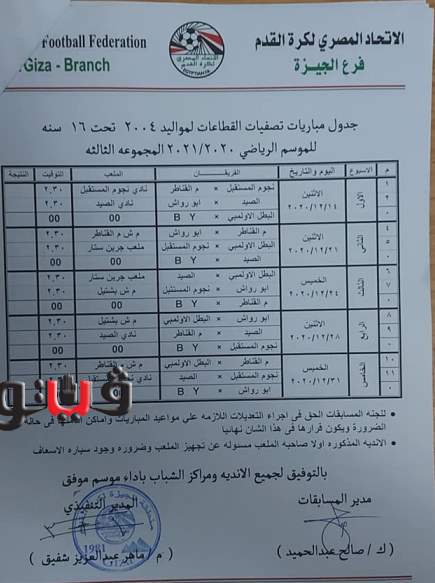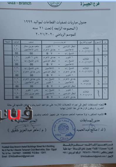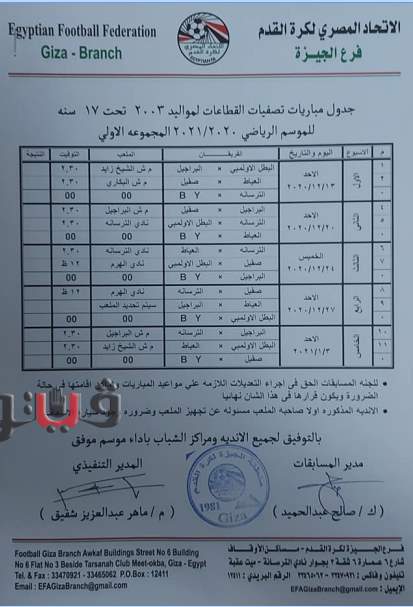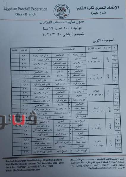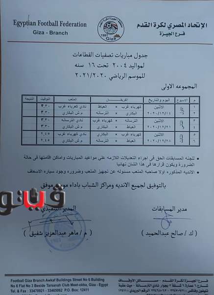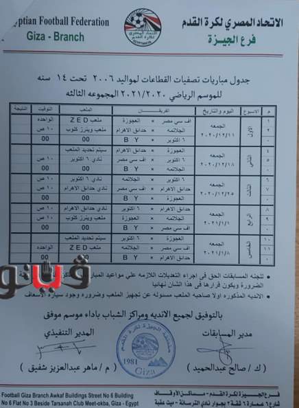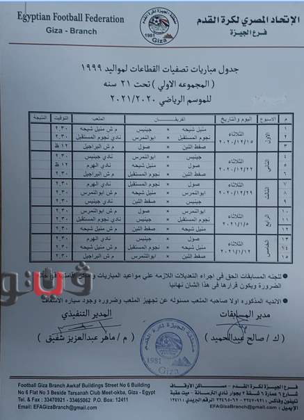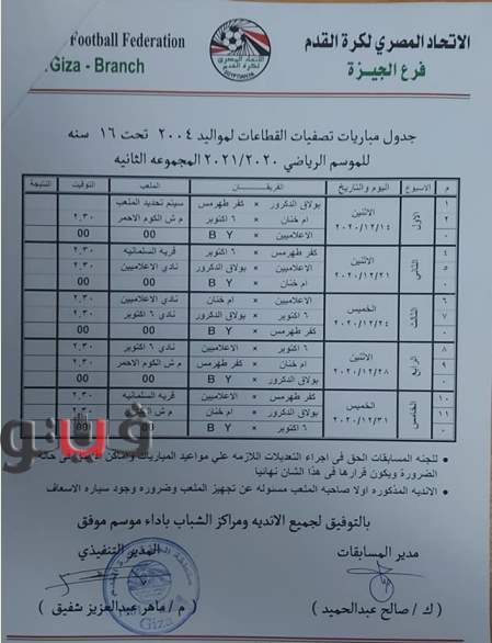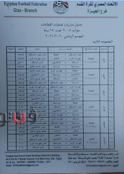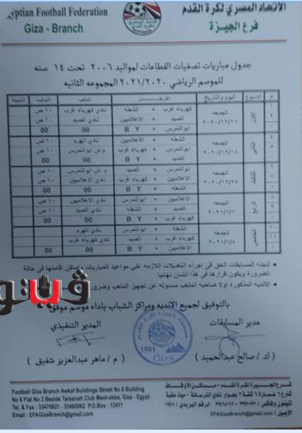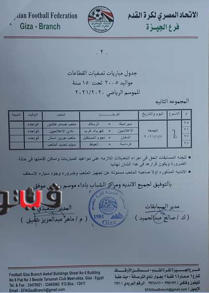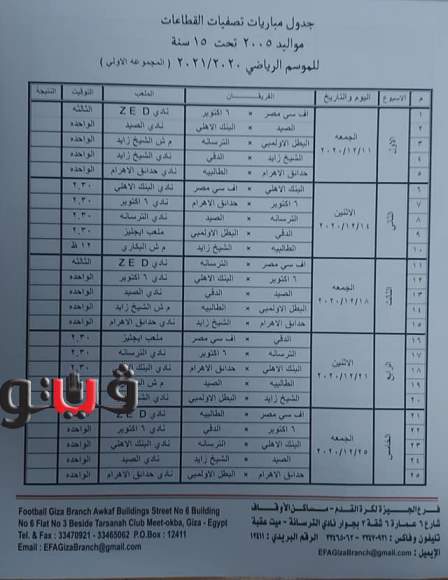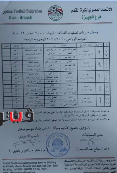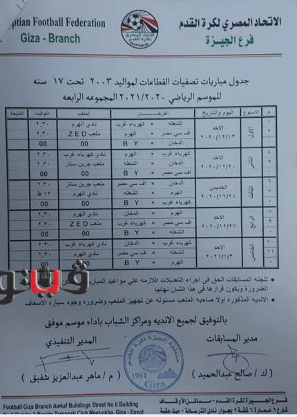 وجاء جدول تصفيات منطقة الجيزة مواليد 2005