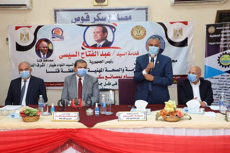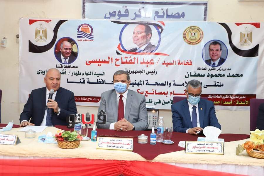 وشهد وزير القوى العاملة، ومحافظ قنا اللواء أشرف الداودي في بداية جولة اليوم، ختام فعاليات ملتقى السلامة والصحة المهنية بمصنع سكر قوص بقنا، تحت عنوان"العمل الأمن في ظل جائحة كورونا"، للوقاية منها ودور السلامة وتأمين بيئة العمل في التعامل الأمن مع الأدوات والمعدات ، وذلك بمشاركة 15 منشأة يمثلون جميع القطاعات الصناعية بالمحافظة ، وأخصائي السلامة والصحة المهنية، وذلك بحضور الدكتور يوسف الغرباوي رئيس جامعة جنوب الوادي، وخالد عيش رئيس النقابة العامة للصناعات الغذائية، وعضو مجلس الشيوخ، وسهير الليثي وكيل وزارة القوي العاملة للسلامة والصحة المهنية وتأمين بيئة العمل ، ومحمد منتصر مدير عام السلامة بالوزارة ، والمهندس محمد إبراهيم مدير المصانع، وأسعد أحمد السيد مدير مديرية القوي العاملة بالمحافظة وسيد حامد رئيس الاتحاد المحلي لعمال قنا والأقصر.