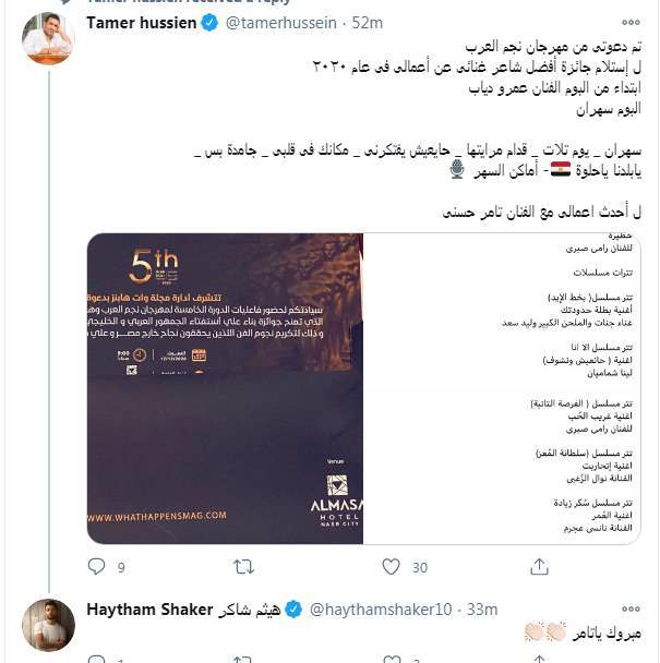 وكتب تامر حسين تغريدة على تويتر "تم دعوتى من مهرجان نجم العرب لاستلام جائزة أفضل شاعر غنائى عن أعمالى فى عام ٢٠٢٠ ابتداء من ألبوم الفنان عمرو دياب ألبوم سهران "سهران _ يوم تلات _ قدام مرايتها _ حايعيش يفتكرنى _ مكانك فى قلبى _ جامدة بس _ يابلدنا ياحلوة - أماكن السهر لأحدث اعمالى مع الفنان تامر حسنى"