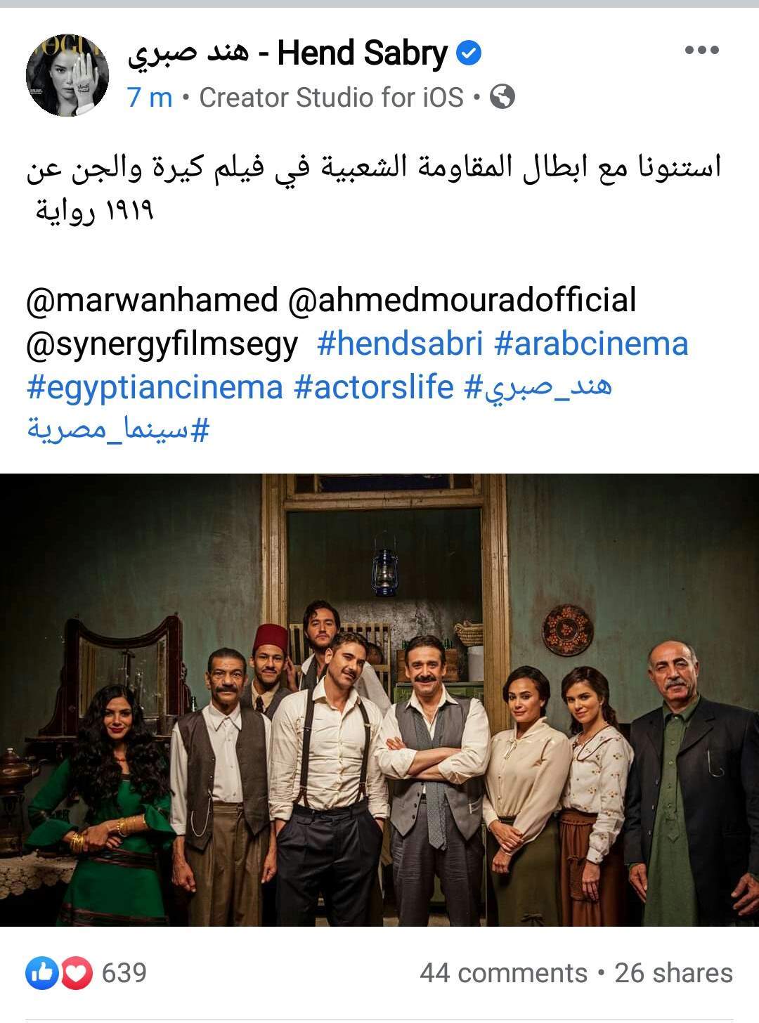 وظهر في الصورة أبطال الفيلم، حيث علقت هند صبري عليها قائلة: "استنونا مع أبطال المقاومة الشعبية في فيلم كيرة والجن عن رواية ١٩١٩".