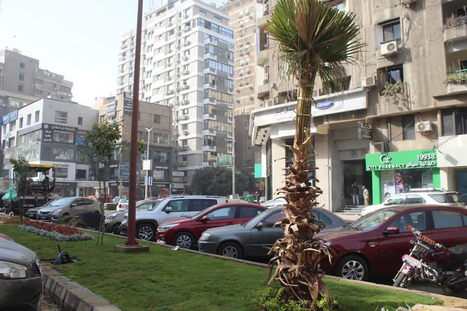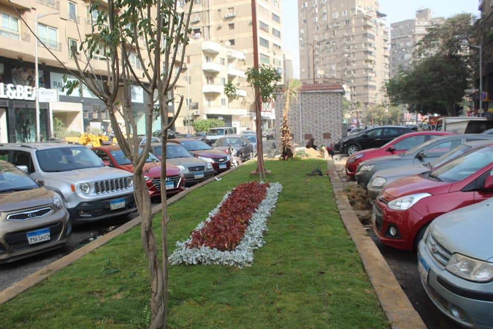 أعمال فرد النجيلة سابقة التجهيز، وزراعة النباتات والزهور بالجزيرة الوسطى بشارع جزيرة العرب، بنطاق حي العجوزة.