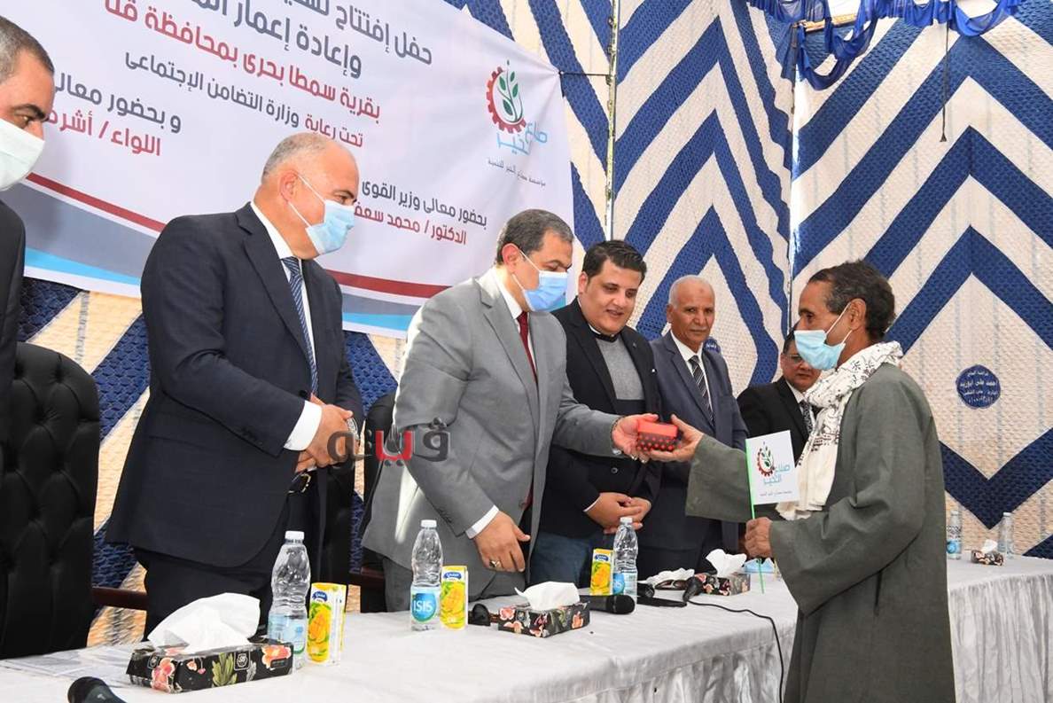 سلم الدكتور محمد سعفان وزير القوى العاملة واللواء أشرف الداودي محافظ قنا مفاتيح ٣٠ منزلا للأسر الأولى بالرعاية في قرية السمطا بحري بمركز دشنا بعد أن تم إعمارها وفرشها بأثاث حديث بالتعاون بين وزارة التضامن الاجتماعي ومؤسسات المجتمع المدني وأحد البنوك (١٨ منزلا مبادرة حياة كريمة - ١٢ منزلا).