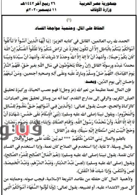 أعلنت وزارة الأوقاف عن موضوع خطبة الجمعة المقبلة تحت عنوان: ”الحفاظ على المال، وحتمية مواجهة الفساد” على موقعها الرسمي أوقاف أون لاين.