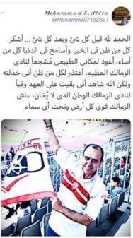 وكتب المستشار محمد عطية على صفحته بموقع التواصل الاجتماعي فيس بوك: "الحمد لله قبل كل شيء وبعد كل شيء.. أشكر كل مَن ظن فيَّ الخير، وأسامح فى الدنيا كل مَن أساء، أعود لمكانى الطبيعى مُشجعًا لنادى الزمالك العظيم، أعتذر لكل مَن ظن أنى خذلته ولكن الله شاهد أنى بقيت على العهد وفيًّا لنادى الزمالك الوطن الذى لا يُخان، عاش الزمالك فوق كل أرض وتحت أى سماء".