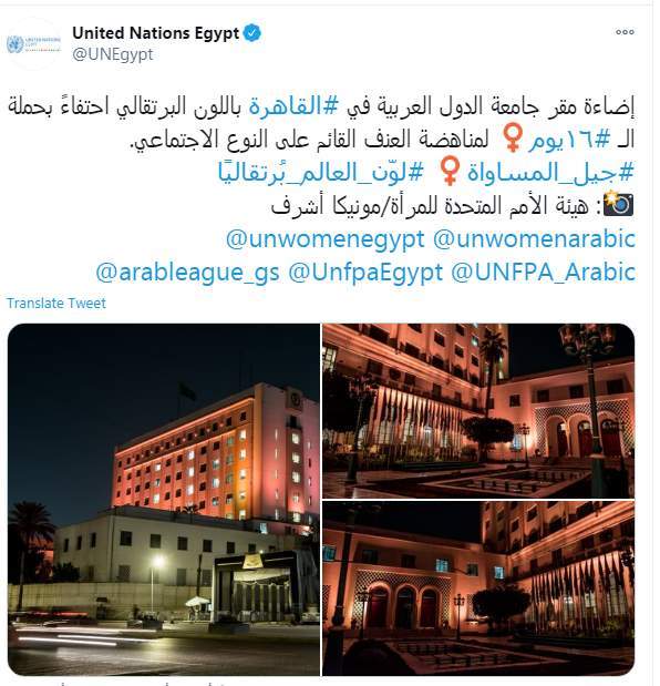 وكتبت هيئة الأمم المتحدة بالقاهرة "إضاءة مقر جامعة الدول العربية في #القاهرة باللون البرتقالي احتفاءً بحملة الـ #١٦يوم لمناهضة العنف القائم على النوع الاجتماعي.. #جيل_المساواة #لوّن_العالم_بُرتقاليًا.. هيئة الأمم المتحدة للمرأة مونيكا أشرف"