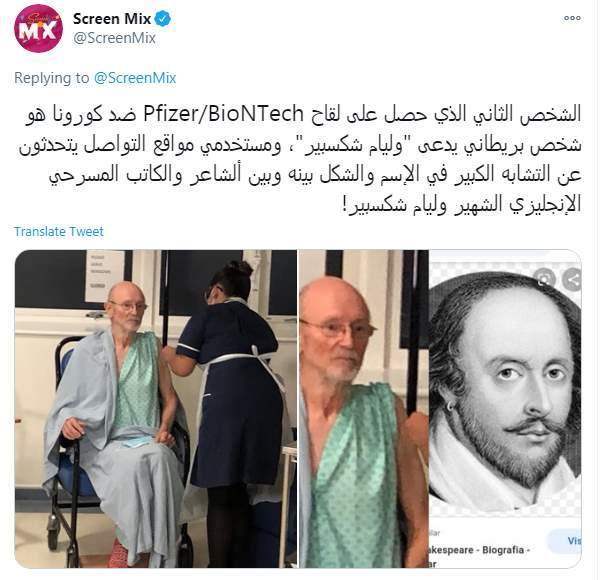 حصل وليام شكسبير، مسن بريطاني، على لقاح فيروس كورونا المستجد كوفيد-19، وهو الشخص الثاني الذي حصل على لقاح Pfizer/BioNTech ضد فيروس كورونا، بعد مارجريت كينان (90 عامًا) من أيرلندا الشمالية، وهي أول شخص وأول امرأة في العالم تأخذ اللقاح المضاد لفيروس كورونا.