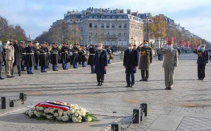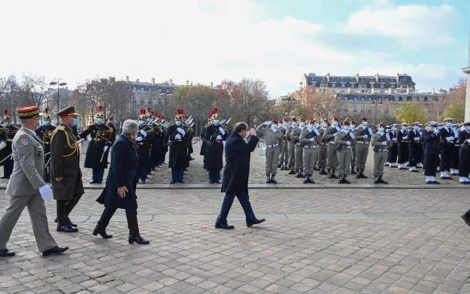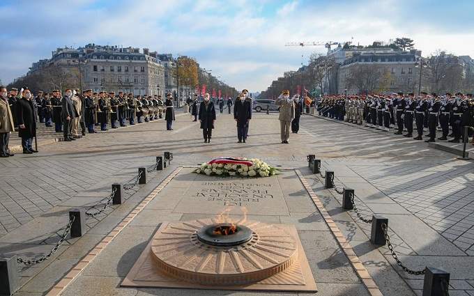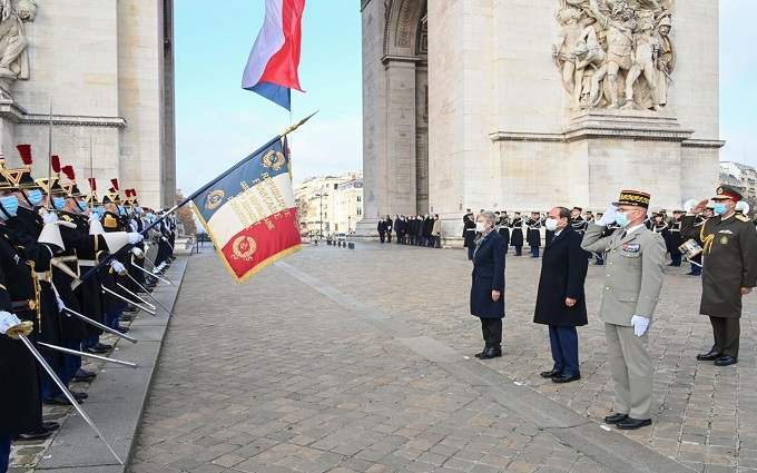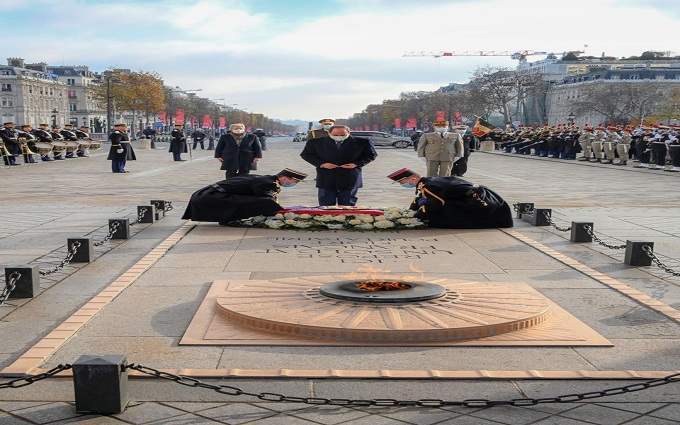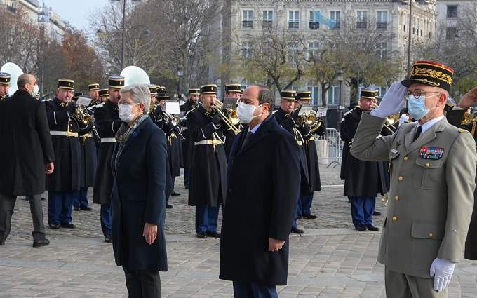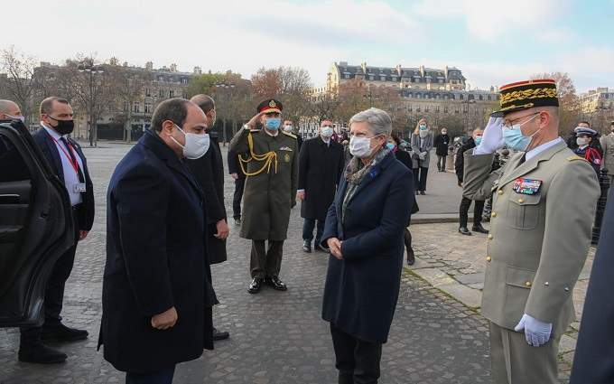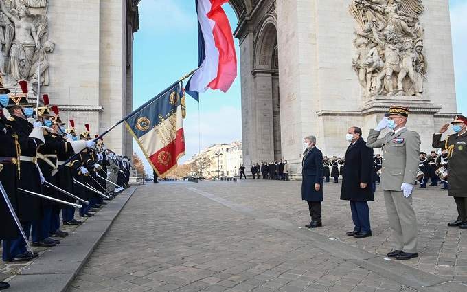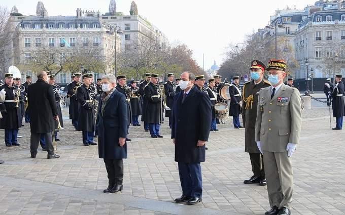 وضع الرئيس عبد الفتاح السيسي إكليلا من الزهور على قبر الجندي المجهول بميدان قوس النصر بالعاصمة باريس، حيث أقيمت المراسم العسكرية الرسمية للرئيس وعزف السلام الوطني للبلدين.