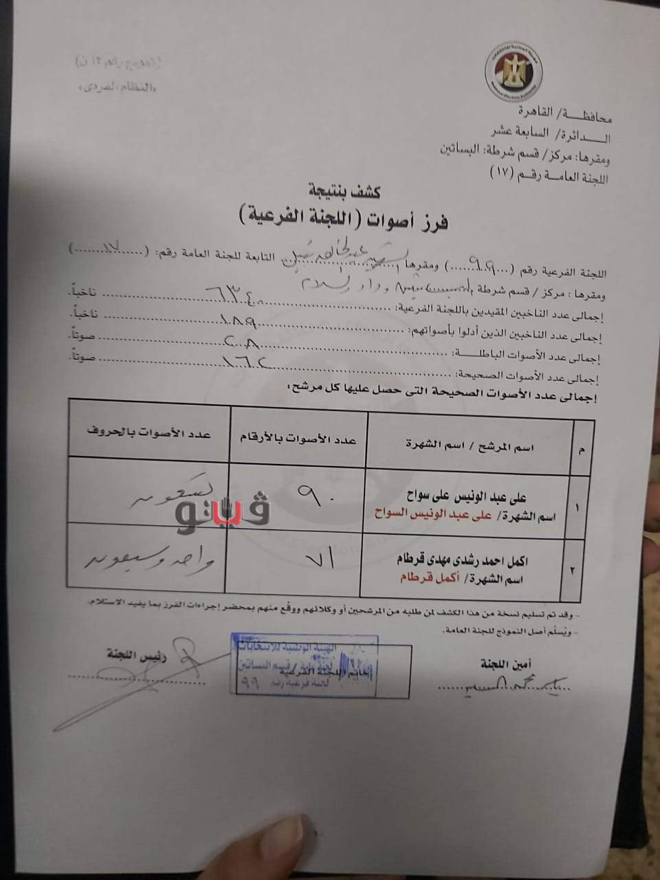 اظهر الحصر العددي لعمليات الفرز في جولة الاعادة في اللجنة الفرعية رقم ٩٩ ومقرها الشهيد عبد الخالق نبيل التابعة للجنة العامة رقم ١٧ عن حصول المرشح علي عبد الونيس علي ٩٠ صوت بينما حصل منافسه كامل قرطام على ٧١ صوت .