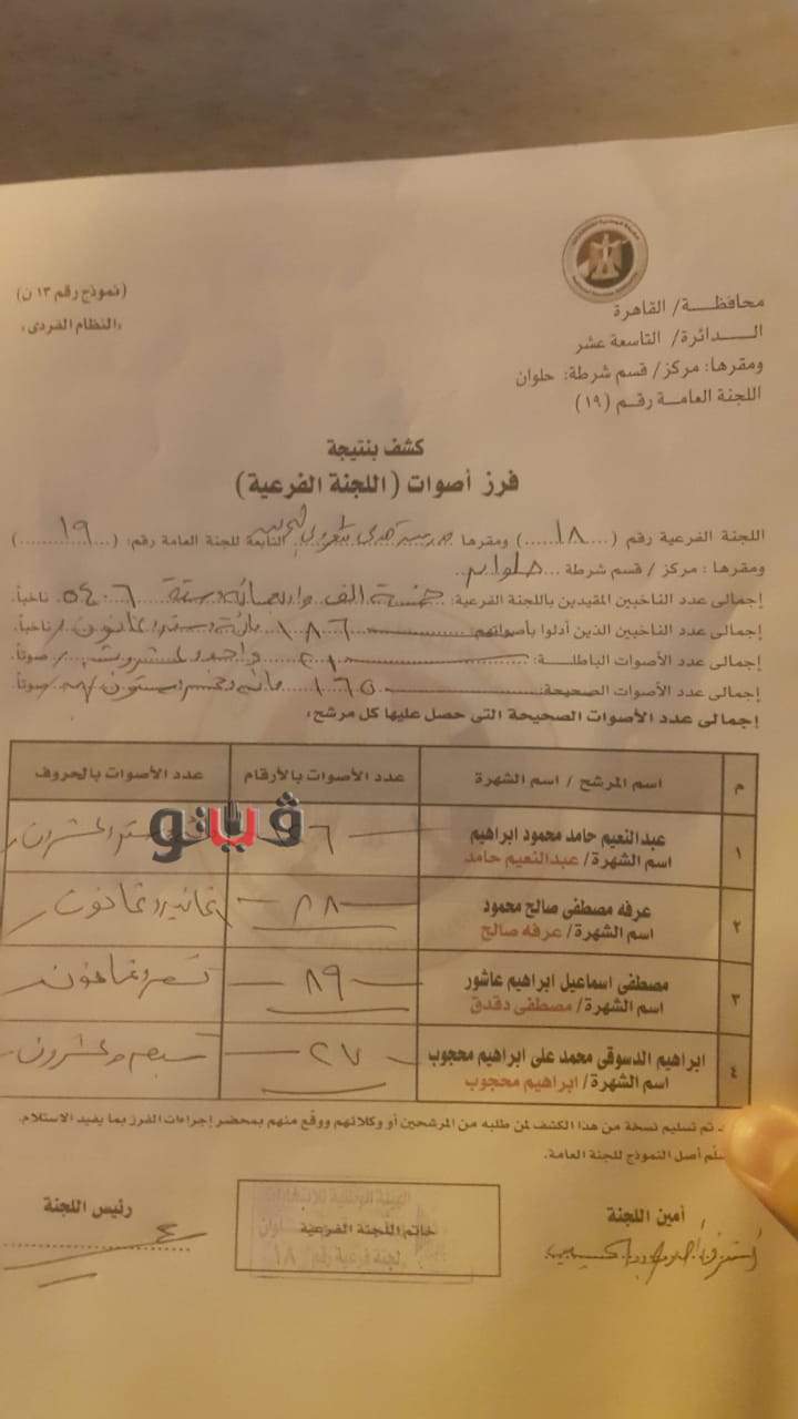 الحصر العددي لأصوات المرشحين باللجنة 18 بدائرة المعصرة وحلوان والتبين و15 مايو